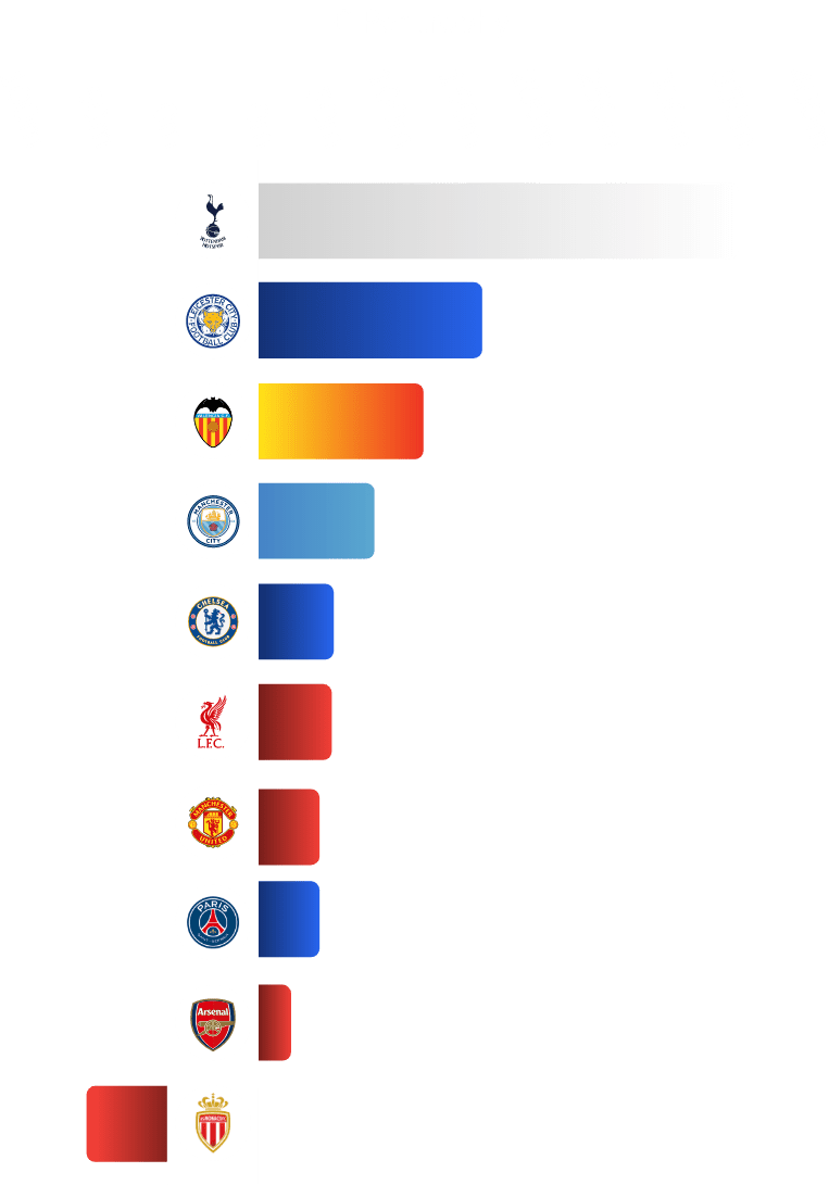 Tottenham Hotspur racked up the highest bill, with a net spend of £349.7 million per trophy, followed by Leicester City with £163.6 million. Valencia CF followed in third, with a net spend of £117.4 million per trophy.